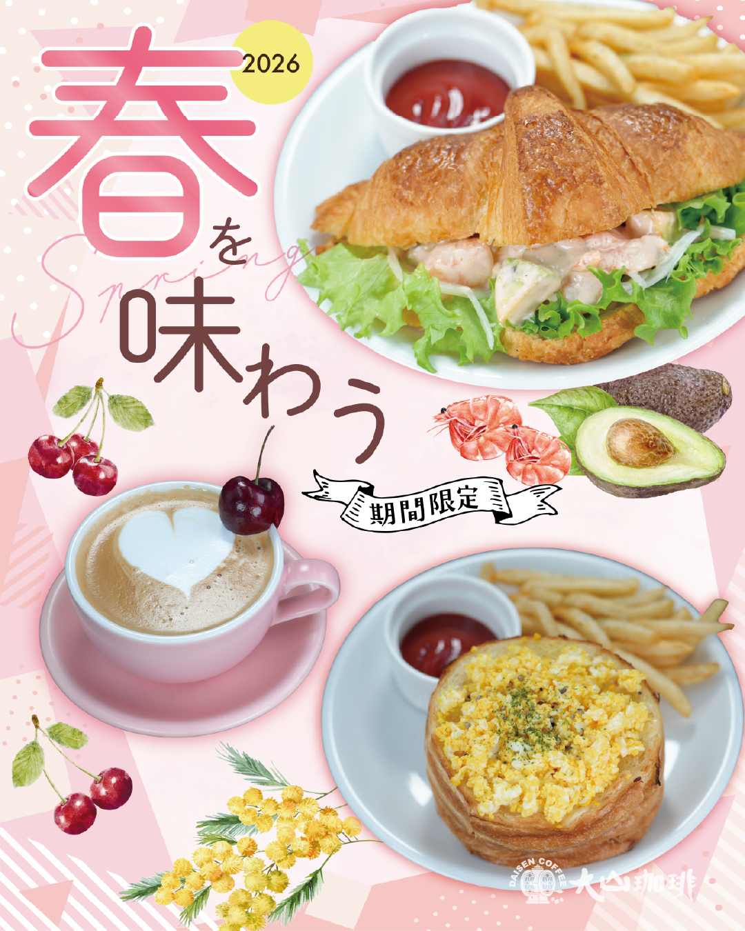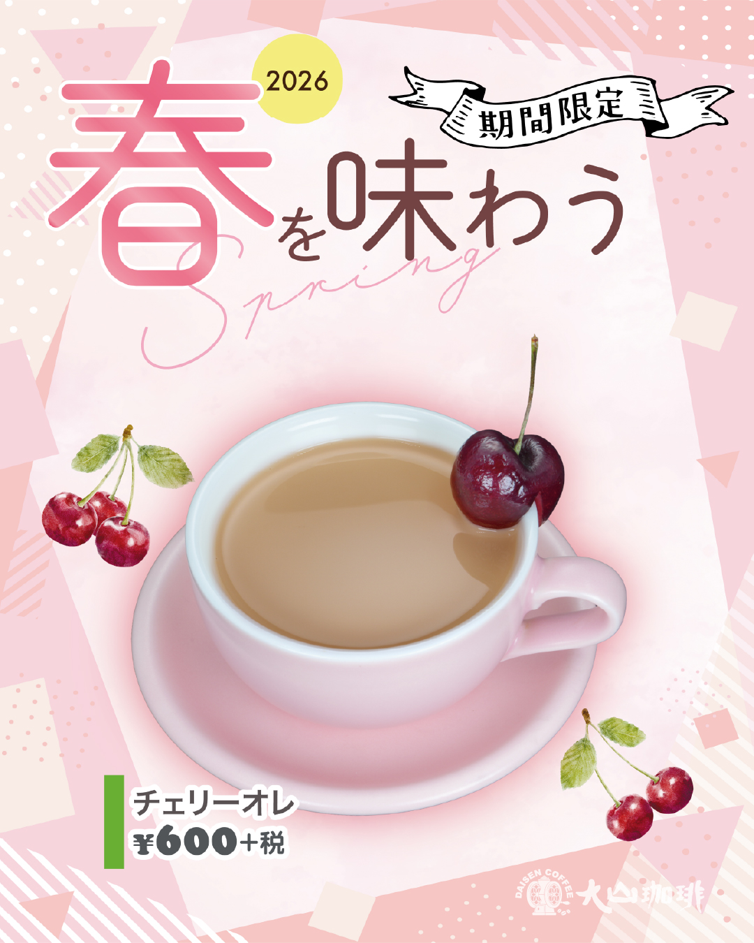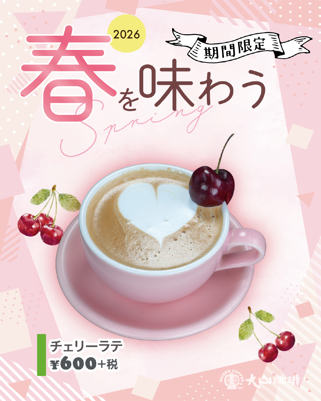 ふわふわミルク、自慢のコーヒーにチェリーシロップを混ぜ合わせ、大満足の春味ラテに仕上げました。甘酸っぱいチェリーも添えてお届けします。